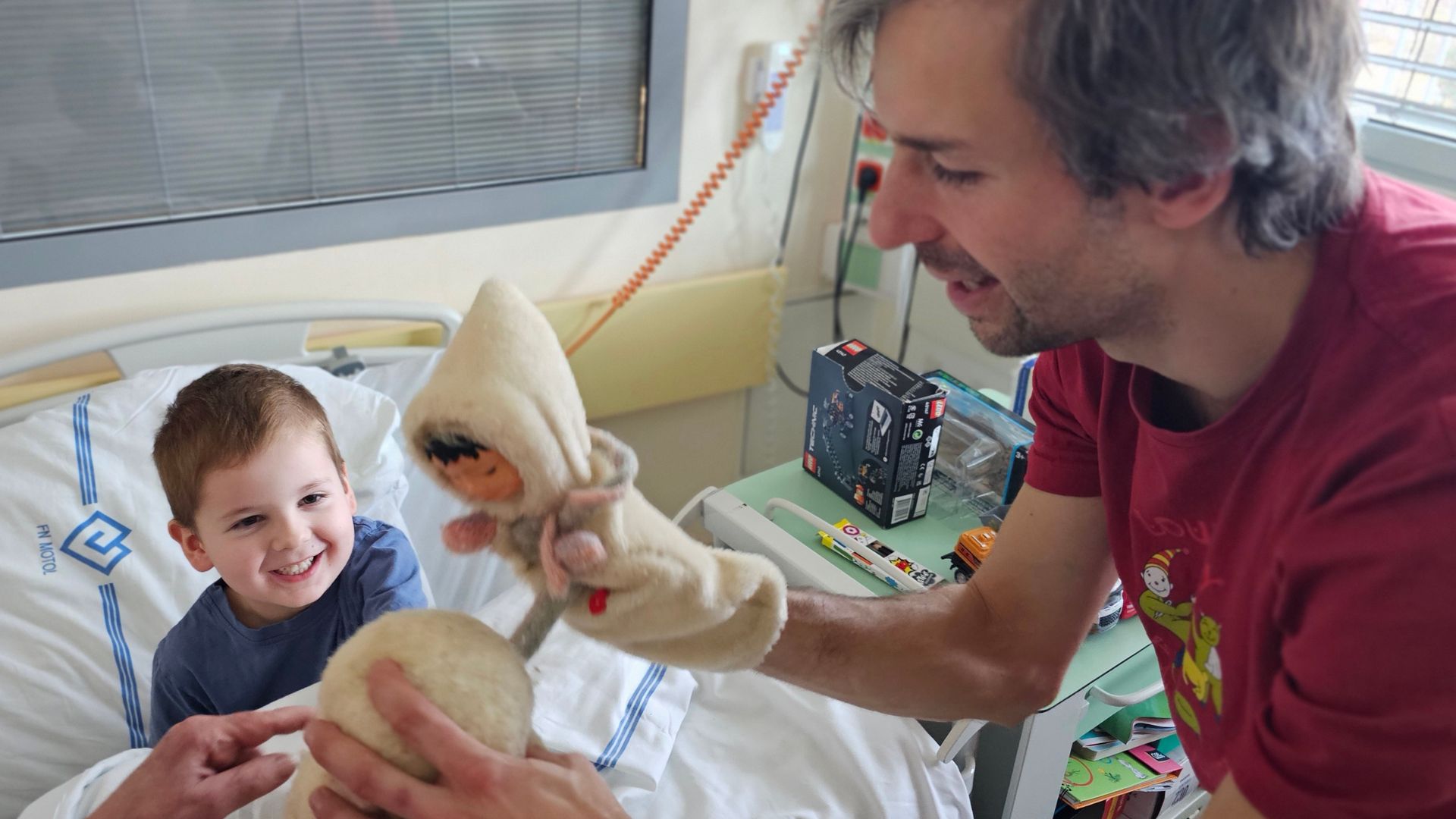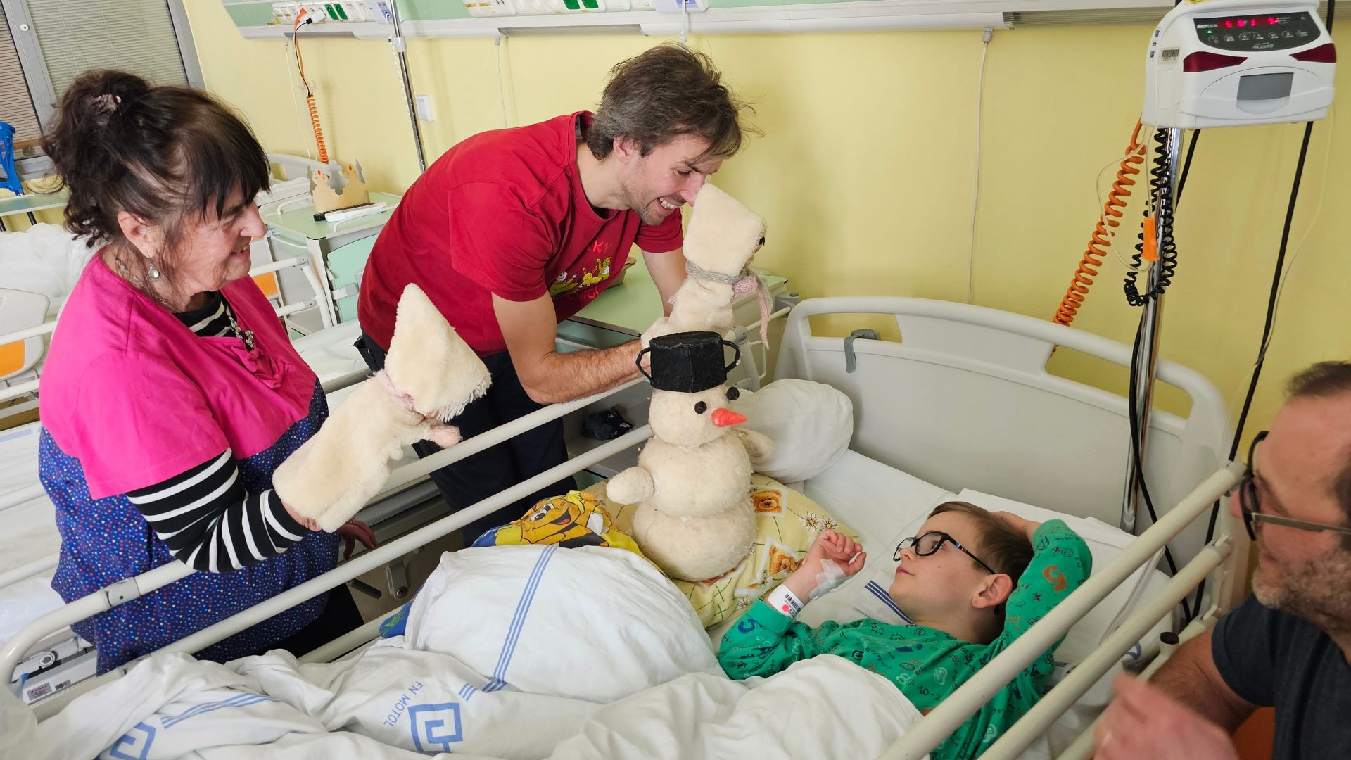 Společně jsme nejprve postavili sněhuláka, začali se koulovat – to vše s loutkami, které jsme přinesli. Ondřej se na chvíli ocitl mimo stěny nemocničního pokoje. Jeho peřina se změnila v zasněžené pláně jižního pólu, a Ondřej se s námi vydal na dobrodružnou cestu. Když jsme končili, smál se, jakoby ztratil pojem o čase a místě. Pro něj to byla nejen zábava, ale i úleva od starostí, které ho provázely během dlouhých týdnů léčby.