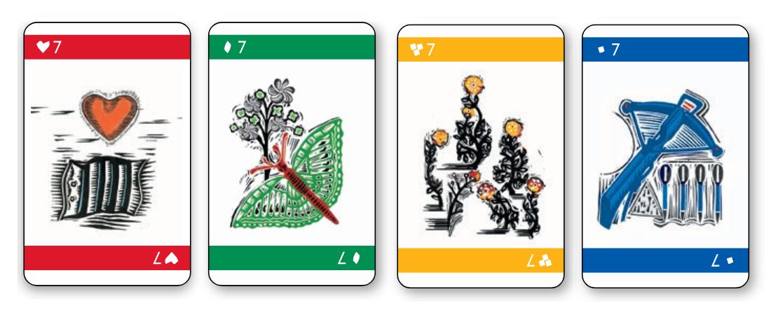 32 karet událostí tvořených mariášovými kartami v posloupnosti hodnot od sedmičky po eso, o síle 7–40