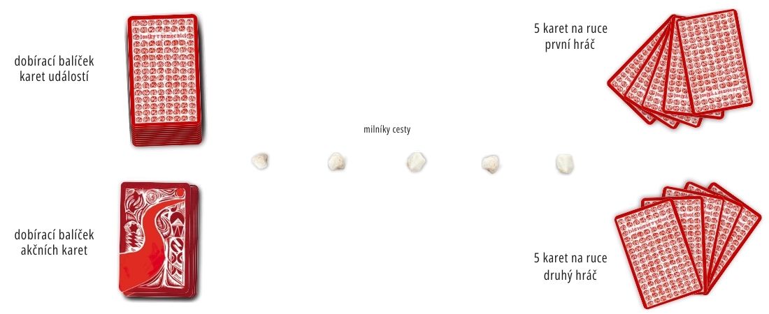 - Zamíchejte karty událostí a rozdejte každému hráči 5 karet. Zbylé karty tvoří dobírací balíček, který položte lícem dolů vedle vytvořené cesty.