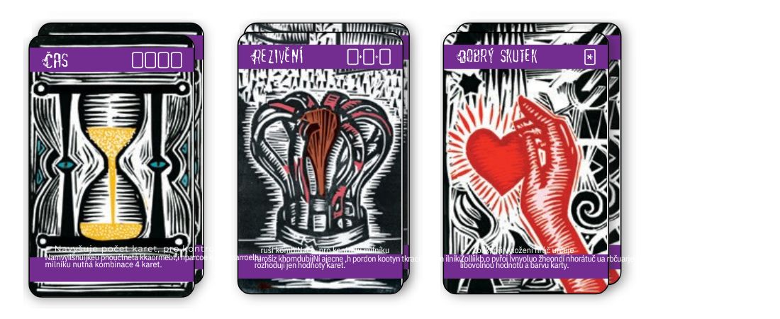 6 akčních fialových karet, tři druhy po dvou kartách: Čas, Rezivění a Dobrý skutek.
