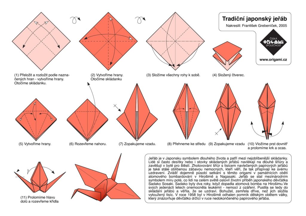 Jeřáb je v Japonsku symbolem dlouhého života a patří mezi nejoblíbenější skládanky. Lidé si často desítky nebo i stovky skládaných jeřábů navlékají na dlouhé šňůry a zavěšují v bytě pro štěstí. Zhotovování šňůr s tisícem navlečených papírových jeřábů je také stále oblíbenou zábavou nemocných, kteří věří, že tak přispívají ke svému uzdravení.